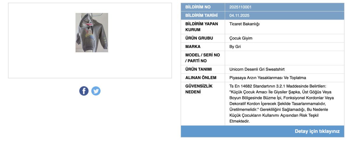 Bakanlık, bir çocuk kıyafetinin küçük çocuklar için risk taşıdığını belirterek satışını yasakladı ve raflardan toplatılmasına karar verdi.